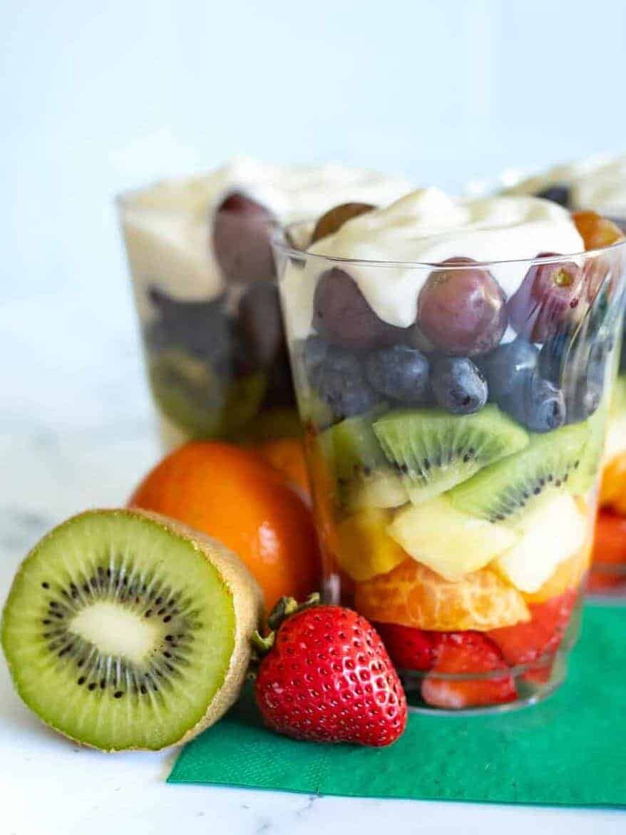 Then grab out your favorite clear classes or parfait cups and start layering in order of the colors of a rainbow. Strawberries, mandarins, pineapple, kiwi, blueberries, and then the grapes.
