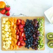 First wash and prepare all of the fruit you are using. I had the kids help with this one, too. We washed the strawberries, grapes, and blueberries. Peel the kiwi and the mandarins. If your kids are helping have them do that and use some kid friendly knives to cut the fruit into pieces.