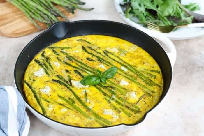 Packed with crisp-tender asparagus, creamy goat cheese, and protein-rich eggs, this dish feels like a treat but comes together in under 30 minutes. It’s perfect for feeding a hungry crowd, prepping meals for the week, or sneaking a few extra veggies onto your family’s plates, no complaints here!