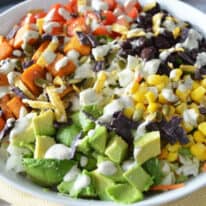 Start with the base: The base is a chopped salad kit. Any brand will do, look for something similar to a Southwest or Taco flavor combo for this recipe. Salad kits also give you some fun (optional) toppings like tortilla strips, sunflower seeds and more.