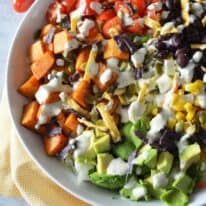 • Assemble salad kit with included toppings and dressing. Top with sweet potatoes, avocado, black beans, corn and tomatoes.