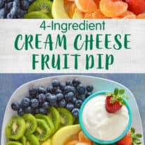 This easy cream cheese fruit dip prepped in 5 minutes, only uses 4 ingredients and is perfect for dipping fruit! It’s lightened up with Greek yogurt for a creamy and delicious snack or dessert.