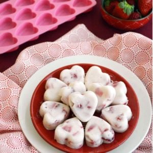 These bite-sized Frozen Strawberry Yogurt Bites are a sweet and delicious treat. Let the kids help mix the ingredients and fill molds for a fun activity. We used these cute heart molds and made them for a Valentine’s Day snack, but I think any day is a good day for a heart-shaped healthy treat 🙂