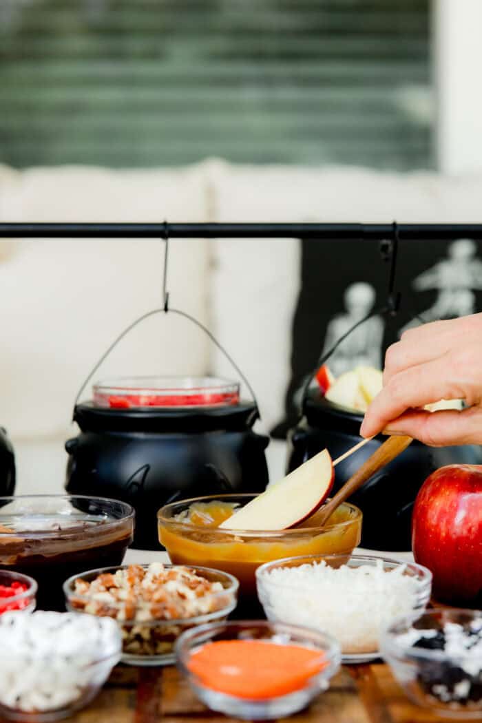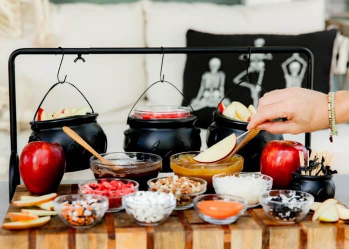 Set up your sliced apple bar with bowls or mini cauldrons of toppings for a festive vibe. We love balancing fun options (like candy eyes, sprinkles, crushed cookies, and mini M&Ms) with wholesome ones (like freeze-dried strawberries, chopped nuts, shredded coconut, and granola). For dips, offer melted red chocolate, dark chocolate, and warm caramel to cover both indulgence and balance.