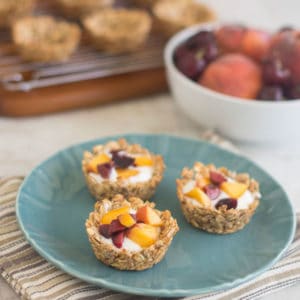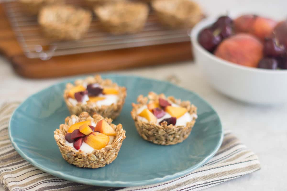 - Fill granola cups with yogurt and top with cherries and peaches.